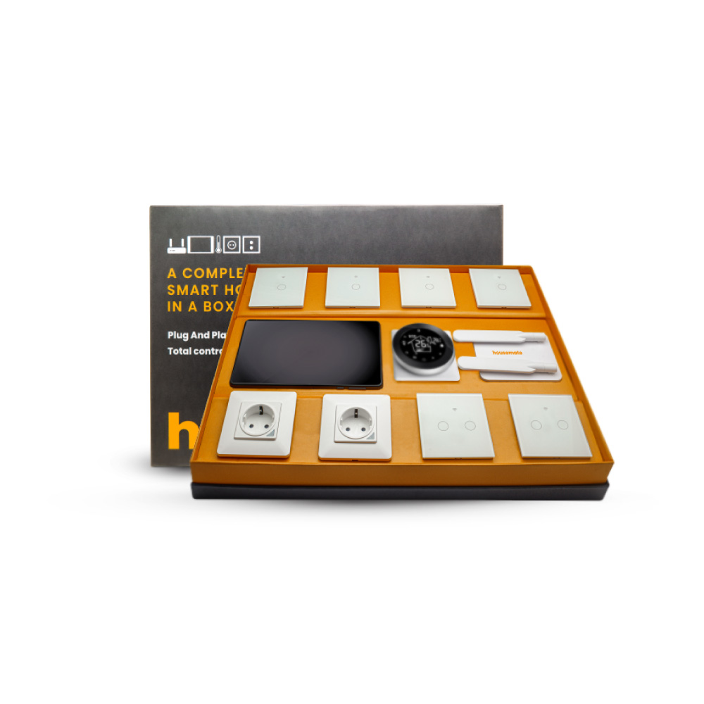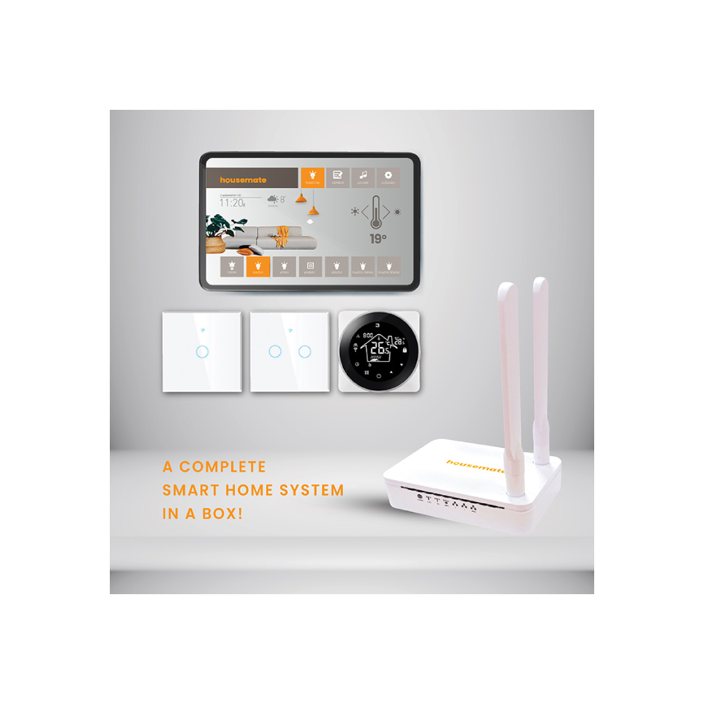 Έξυπνο πακέτο Housemate με hub, διακόπτες, πρίζες και θερμοστάτη. Ελέγχεις φωτισμό και θερμοκρασία με φωνή ή εφαρμογή, εύκολη εγκατάσταση χωρίς καλωδιώσεις και πλήρη διαχείριση όπου κι αν βρίσκεσαι.